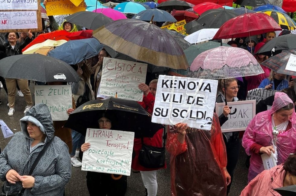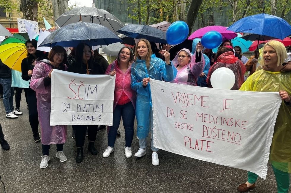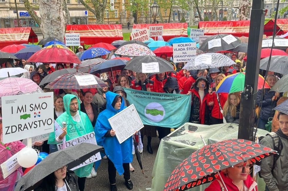 Samostalni sindikat zaposlenih u zdravstvu i socijalnoj skrbi Hrvatske (SSZSSH) te Hrvatski strukovni sindikat medicinskih sestara i tehničara (HSSMS-MT) organizirali su prosvjed upozorenja I mi smo zdravstvo na zagrebačkom Zrinjevcu. Okupilo se oko tisuću medicinskih sestara, tehničara, fizioterapeuta, primalja, kuhara, spremačica i ostalog nemedicinskog osoblja iz cijele Hrvatske koji su ponovno upozorili na neravnopravnost radnika u zdravstvenom sustavu, kao i na sramotno male plaće.