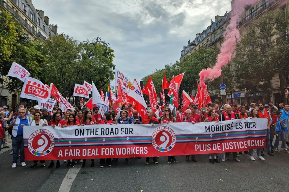 Sindikalisti iz cijele Europe pridružilo se akciji koju je organiziralo osam francuskih sindikata protiv mjera štednje i za povećanje plaća, mirovina i jednakost spolova. ETUC poziva na produljenje suspenzije fiskalnih pravila EU-a za još jednu godinu kako bi se dalo vremena za odgovarajuću raspravu o posljedicama i alternativama ponovnom nametanju mjera štednje.
