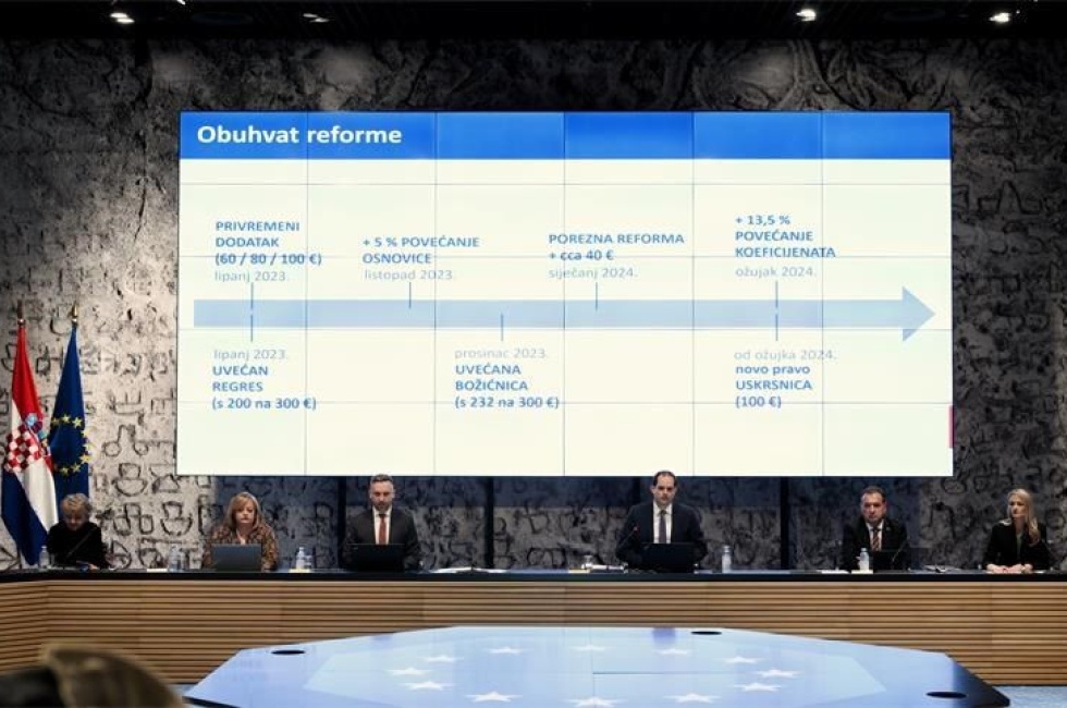 Vlada RH predstavila je konačni prijedlog uredbi o novim koeficijentima za 244.000 radnika u državnim i javnim službama, a čije bi plaće u prosjeku trebale rasti 13,5 posto. Ukupna vrijednost tog paketa je 880 milijuna eura. Sindikati javnih i državnih službi svoje mišljenje o uredbama trebaju poslati do 8. veljače, a planirano je da na snagu stupaju 1. ožujka.