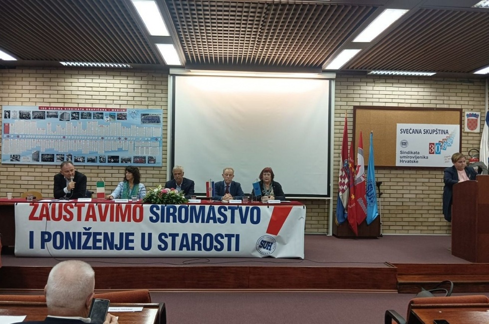 ZAGREB, 25. listopada 2022. - Povodom 30. obljetnice osnutka Sindikata umirovljenika Hrvatske (SUH) organizirana je panel rasprava "Važnost samoorganiziranja umirovljenika u borbi za njihov standard i dostojanstvo" na kojoj je sudjelovalo više od 50 umirovljenika i predstavnika starijih osoba iz 10 hrvatskih županija, te ugledni međunarodni predavači i stručnjaci koji se bave pitanjima organiziranja umirovljenika i starijih osoba - generalni tajnik Europske federacije umirovljenika i starijih osoba (FERPA) Agostino Siciliano, te predstavnici regionalnog talijanskog Sindikata umirovljenika, Elena De Gregorio iz SPI CGIL Veneto i Roberto Treu iz SPI Cgil Friuli-Venezia-Giulia.