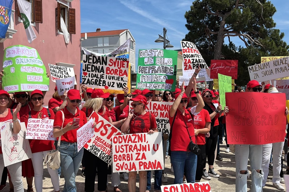 Prosvjed je vodila tajnica SOMK-a Đurđica Kahlina koja je nakon pozdravljanja okupljenih podsjetila da radnice dječjeg vrtića Ivane Brlić Mažuranić štrajkaju zbog nepoštivanja Ustavom i zakonima zajamčenih prava na sindikalno organiziranje i kolektivno pregovaranje, kao i da su Zakon o radu i Zakon o predškolskom odgoju i obrazovanju već skoro 28, tj. 27 godina u primjeni, a gradonačelnik Biograda na Moru Ivan Knez u medijima tvrdi da su zakoni nezakoniti.