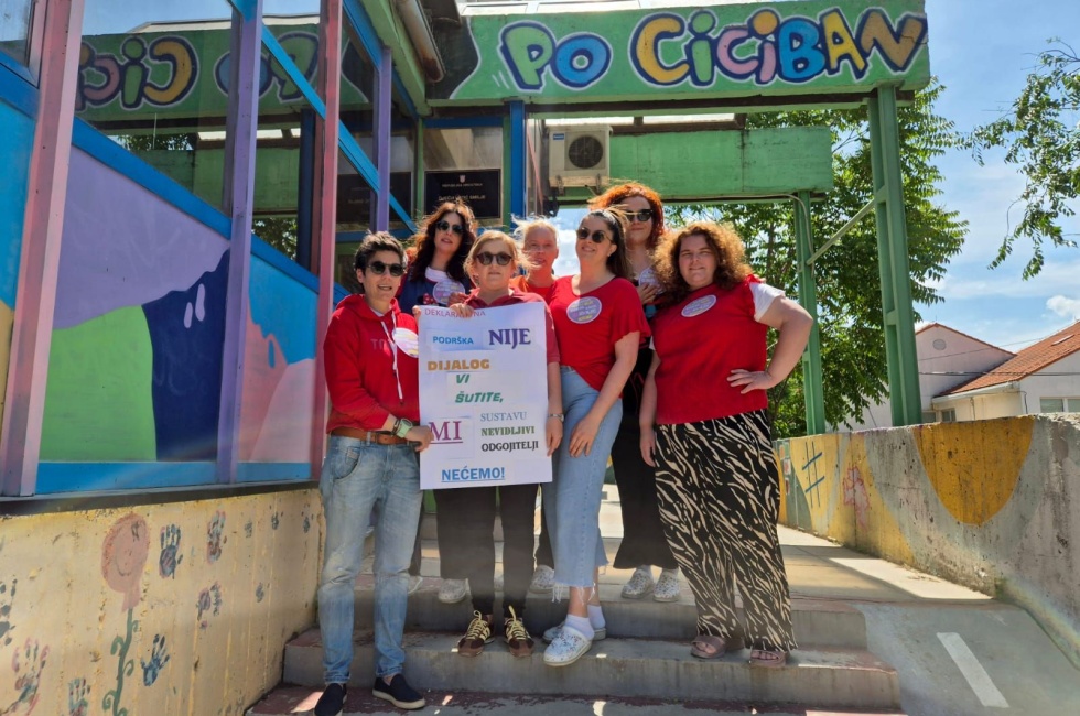 U mnogobrojnim dječjim vrtićima iz cijele Hrvatske, radnice i radnici su na 10 minuta izašli u vanjski prostor te su se fotografirali s transparentima i bedževima.