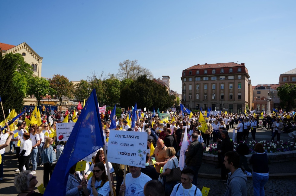 Predsjednik Vlade jučer je rekao da će pozorno slušati što će se govoriti na prosvjedu. Evo, gospodine Plenkoviću, moja malenkost i moje kolege poslat ćemo vam zahtjeve. Reći ćemo što nas boli, što boli sve ove ljude koji su danas ovdje došli.