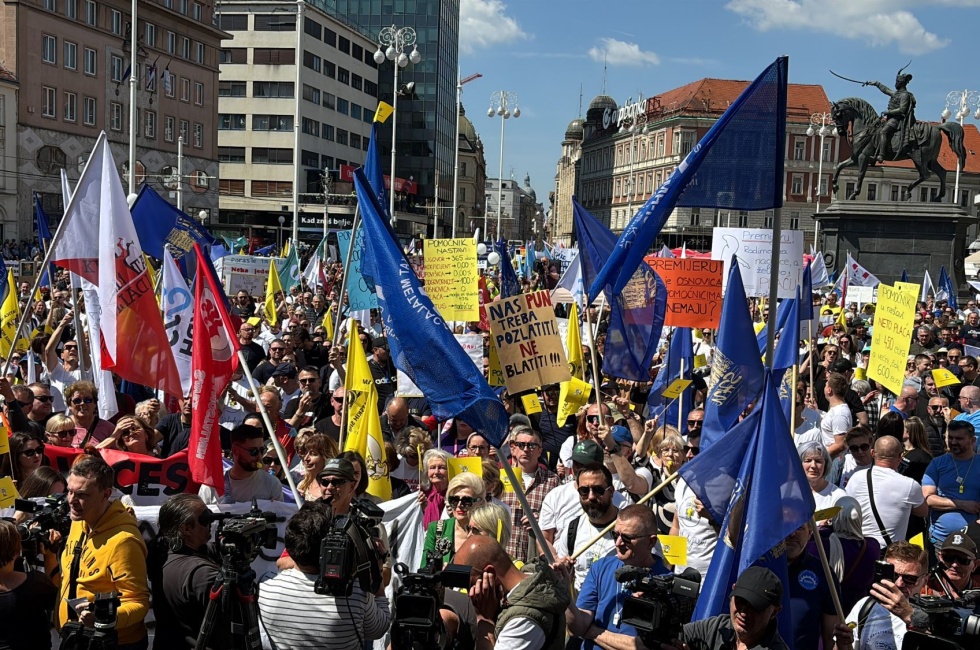 Glavni zagrebački trg bio je ispunjen energijom koja nije bila samo izraz nezadovoljstva, nego i nade. Program je počeo nešto iza 11:00 sati, a vodili su ga glumci Maruška Aras i Andrija Nazlić, koji su „zagrijavali“ okupljene uoči dolaska sindikalne povorke.