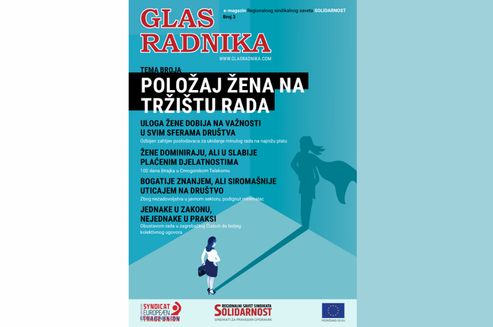 Treće izdanje e-magazina Regionalnog sindikalnog vijeća „Solidarnost“ GLAS RADNIKA u temi broja bavi se položajem žena na tržištu rada. Prvi puta u povijesti sindikalnog pokreta na ovim područjima, žene su na liderskim pozicijama u sindikalnim središnjicama u Srbiji (UGS NEZAVISNOST), Sloveniji (ZSSS) i Bosne i Hercegovine (SSRS).