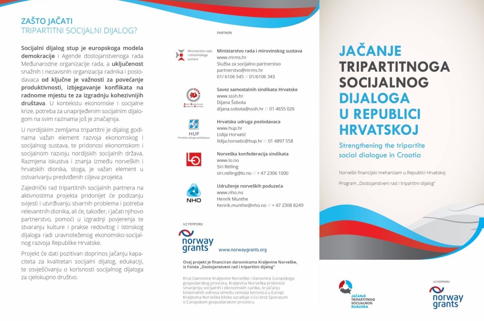 The project was implemented by the Ministry of Labour and the Pension System (MRMS) and the project partners were the Union of Autonomous Trade Unions of Croatia (UATUC), the Croatian Employers’ Association (HUP), the Norwegian Confederation of Trade Unions (LO) and the Confederation of Norwegian Enterprise (NHO), with the participation of the Norwegian Ministry of Labour and the Fafo Research Foundation.